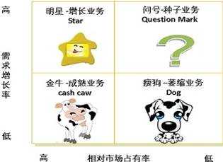 業(yè)務組合的傳統(tǒng)設計所依據的經典理論,最為人們所熟悉的首先當屬波士頓矩陣。波士頓矩陣以縱軸的市場吸引力和橫軸的業(yè)務競爭能力來劃分出四個象限,用以得出企業(yè)所擁有的業(yè)務取舍的決策。其中,市場引力選用的指標是市場需求的增長速度,而業(yè)務競爭力的衡量指標是該業(yè)務所占有的市場份額大小。